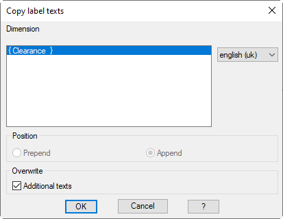 When you activate the tick box, you can use additional texts on other dimensions. To do this, the Dialog box Copy label texts is shown.