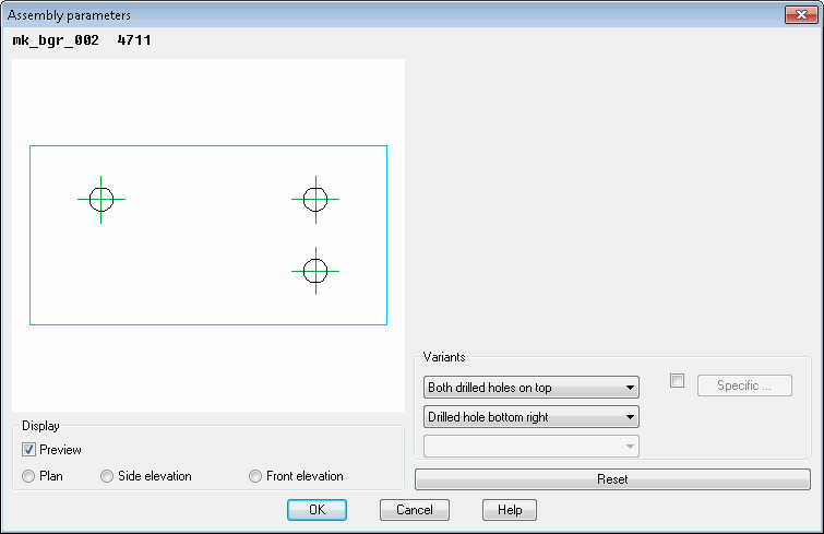 If you want to use assemblies with variants in the drawing, the Dialog box Assembly parameters is displayed. Here, you can set the variant of the assembly which you want to use.
