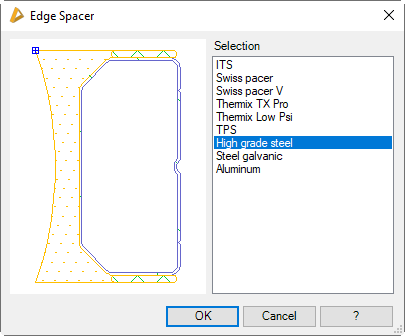 Select the required edge spacer from the pick list. With triple panes with two cavities 3-fold spacers are also offered (see illustration). If you use them, you must note the following: The 3-fold spacer must be assigned to the first cavity from outside and the middle layer must be defined with negative overlap (approx. half the layer thickness).