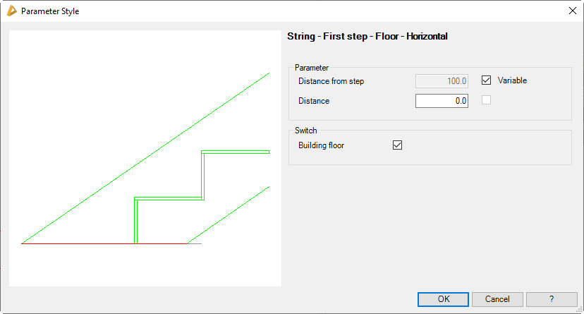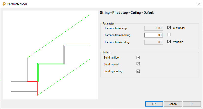 In these dialog boxes you define the parameters for the string connection to the first step. The connection can occur on the floor, on a ceiling and on an intermediate landing. Generally, a differentiation is made between standard, horizontal and vertical connections.