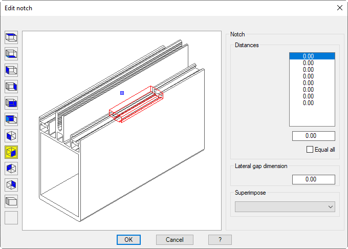 Lists the distances for each side of the notch. The side belonging to the marked value is identified with an x in the front view. To change the distance you can mark the value in the list and change it in the input field.