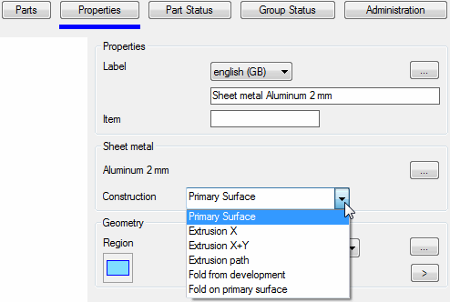 Tab Properties of the Sheet metal component type