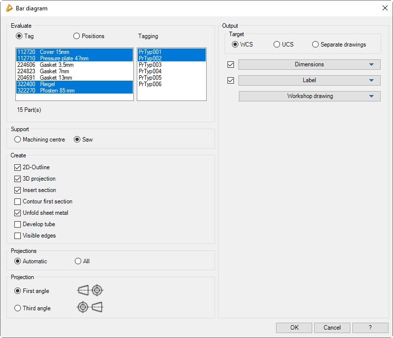 If you quit the dialog box with OK, the bar diagrams are generated. If they generate workshop drawings, they are automatically saved. If you insert the bar diagrams into the WCS or UCS of the drawing, then follows: