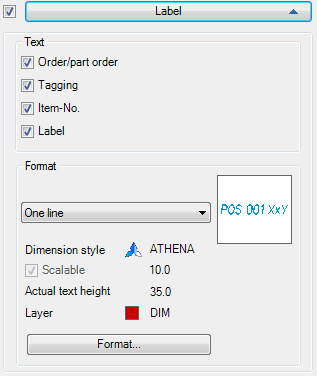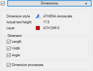 The switch to the left of the drop-down menu activates dimensioning. Important dimension settings (dimension style, actual text height and dimension layer) are displayed for information.