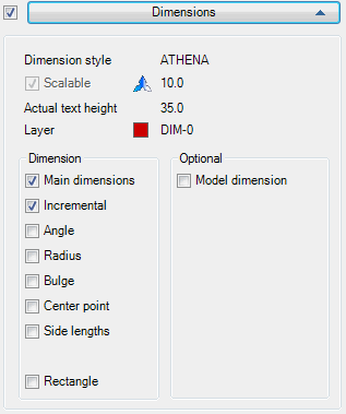 The switch to the left of the drop-down menu activates dimensioning. Important dimension settings (dimension style, actual text height and dimension layer) are displayed for information.