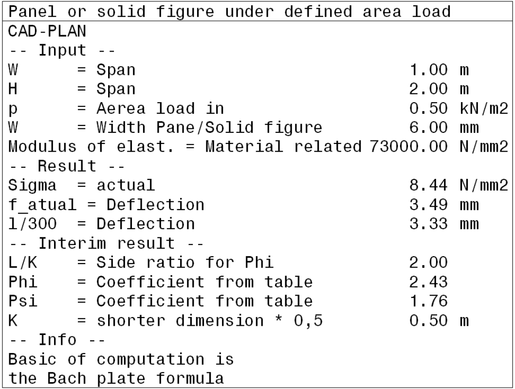 With this program section you can carry out a thickness computation of a solid under a defined area load (e.g. wind or snow). The basis for the computation is Bach's plate formula.