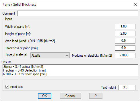 In the input field Thickness of pane [mm] enter the thickness of the solid in mm. With the pick list Type of material you choose the material used for the solid. The modulus of elasticity of the selected material is automatically entered into the input field Modulus of elasticity (N/mm2). If required, you can correct the value for the modulus of elasticity. The results of the computation are displayed immediately in the output field Results . When you activate the tick box Insert text, a results table is inserted into the drawing after clicking OK. You can define the text height of the results table in the Text height input field. The default for the text height is the current dimension figure height. When you terminate the dialog box with OK, the current entries are saved for the duration of the drawing session. With Cancel, the entries are discarded.