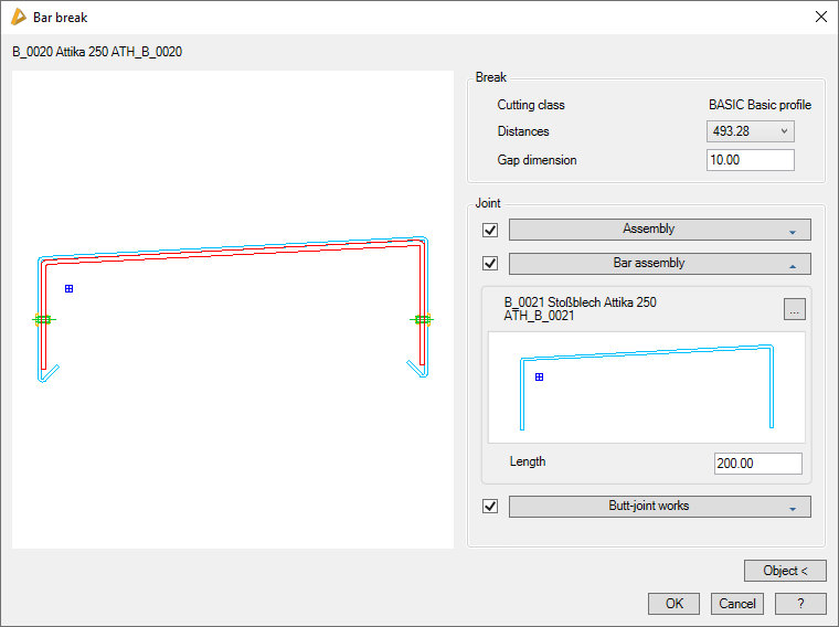 Opens the Dialog box Bar break, where you can adjust further settings, such as the gap dimension and the joint.