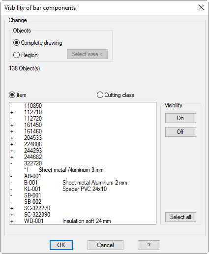 Depending on the setting, this shows the components or the cutting classes of the drawing or of the selected region. Here, you choose the bar components which are to be displayed or suppressed. Keep the Ctrl and Shift keys pressed to select several bar components.