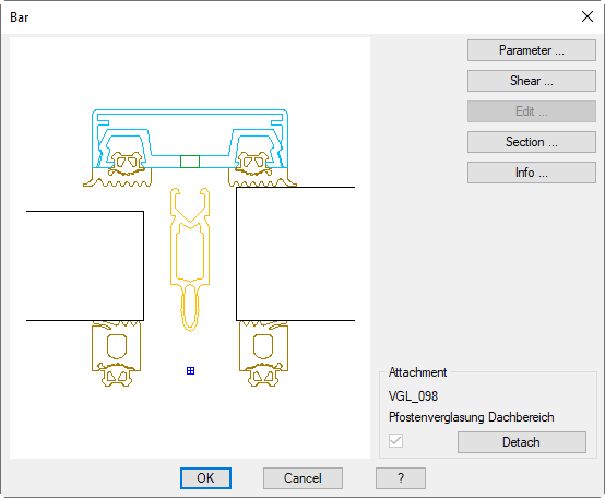 In this dialog box you can modify various properties of an inserted assembly section. This dialog box is activated when you double click a bar assembly in the drawing.