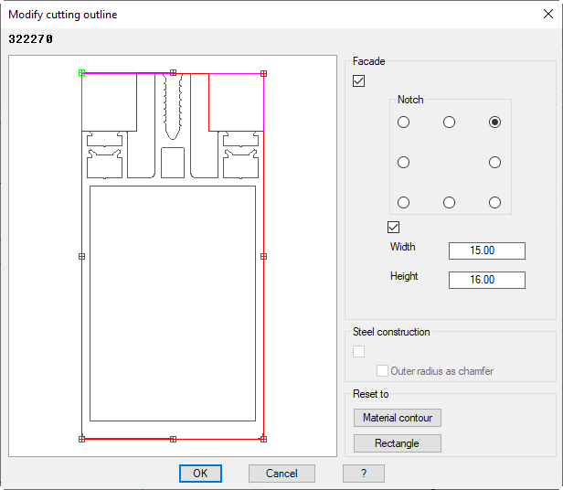 Activates the facade mode where you can define rectangular notches by parameters. The current cutting outline is displayed in the color of magenta. When you define a notch, the cutting outline is recalculated and shown in red.