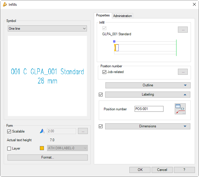 With this routine you can insert infills (glazing, panels, ...) into the drawing as a 2D view. The infills are provided with a position number and dimensions and can optionally be completely dimensioned.