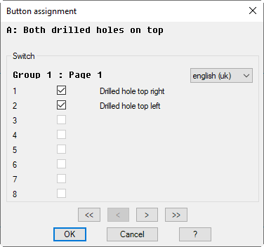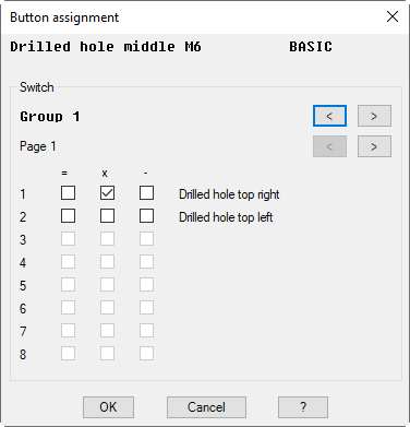 Defines the tick box settings for the criterion. By ticking or clearing you can define what is to occur during the selection of the appropriate variants (criterion). Example: For the criterion Both drilled holes on top, the tick boxes for the drilled hole at the top right and the drilled hole at the top left are ticked.