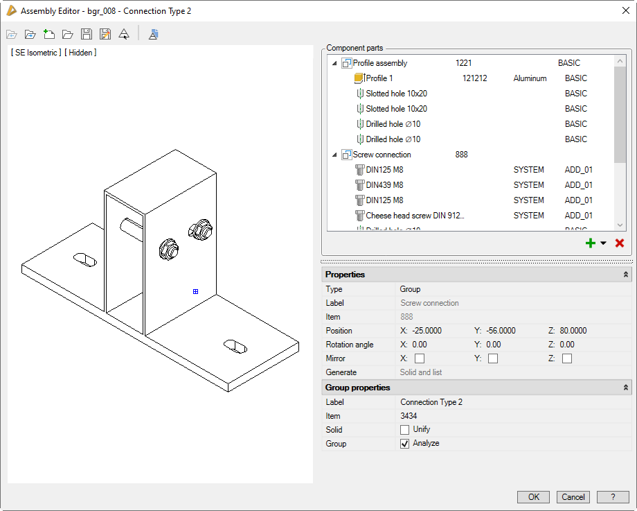 This function is used for creating and editing common assemblies. These can be used as a spatial 3D part or as a 2D projection directly in the drawing. With Apply arrangement, an assembly can be connected with abar by using rules. Common assemblies are, for example: