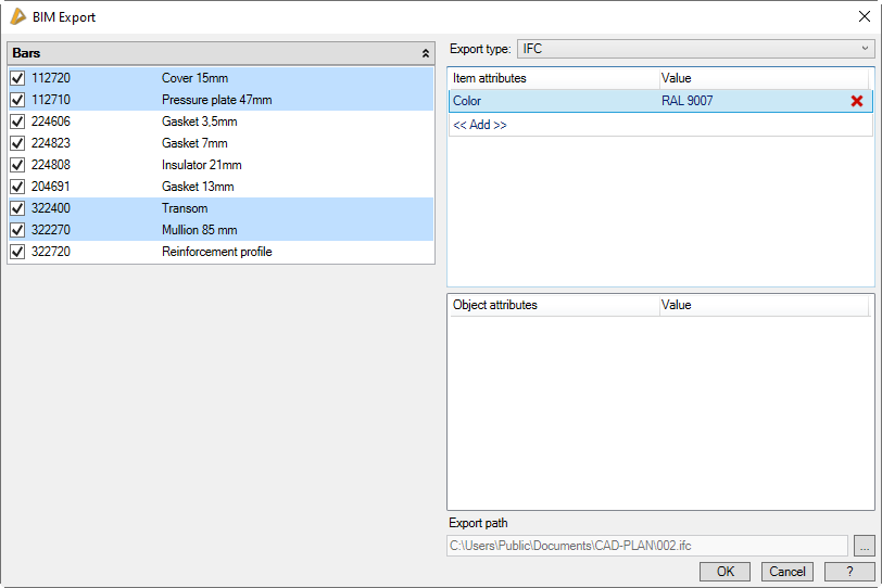 Dialog box Export to BIM