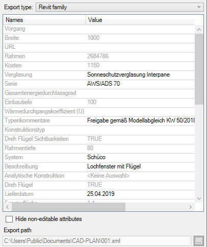 When importing the Revit family, their attributes are read from an *.xml file and displayed here. At this point you can adjust all text attributes.