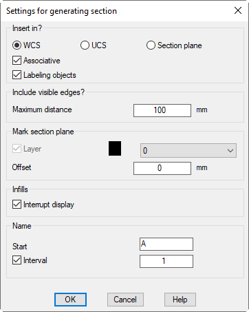 The tick box activates the sectional plane marking. In the pull-down menu you can select a layer for marking.