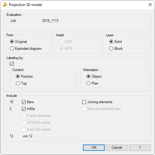 Creates a two-dimensional view from the selected 3D elements. The selection of the 3D elements is done by job selection or object selection.