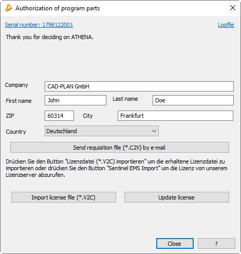 Press this button to import a license file (*.V2C) which you have received from CAD-PLAN. Through the import the required data for the release of ATHENA 2021 is written to your hardware protection plug.