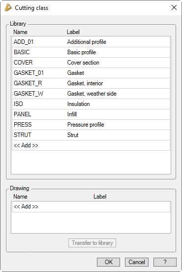 In this section, the cutting classes of the drawing are displayed, unless they are identical to those of your working environment.