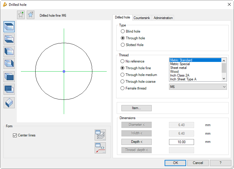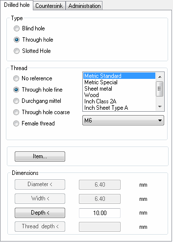 Defines the thread depth of the hole. With this tick box the dialog box Drilled hole is temporarily closed and you can define the thread depth by choosing two points.