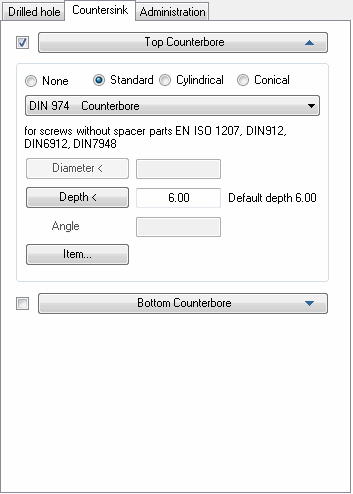 Defines the depth of the counterbore. With standard counterbores the default depth is suggested. With this tick box the dialog box Drilled hole is temporarily closed and you can define the depth by choosing two points.