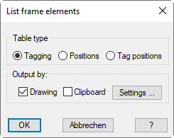 After termination of the dialog box with OK, then, depending on the setting, the list of frame elements is inserted into the drawing and/or copied to the clipboard. After copying to the clipboard, a message appears which you must confirm. With insertion into the drawing, the following appears: