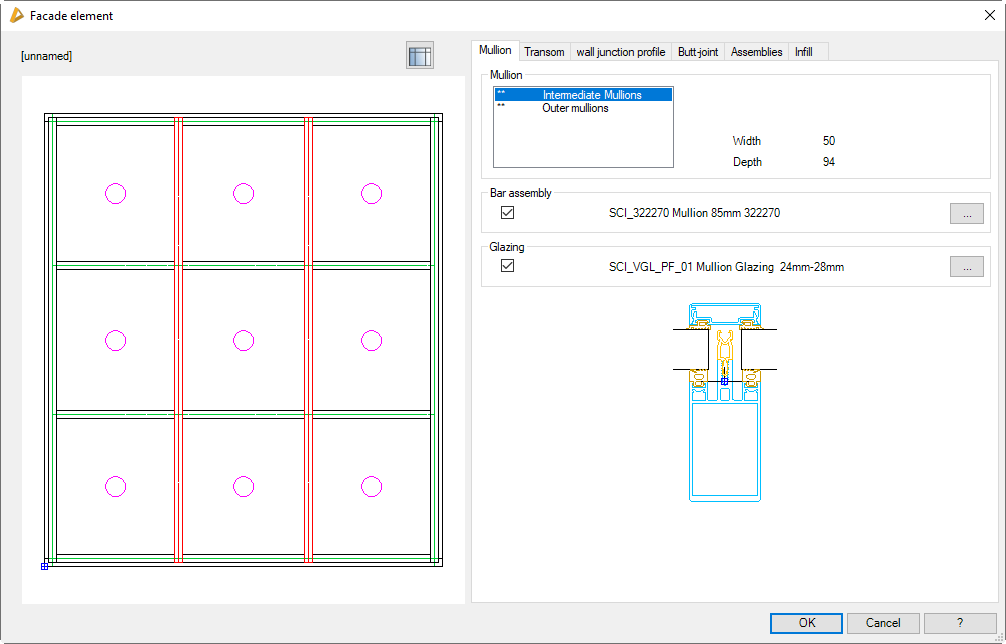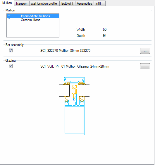 Here, the various types of mullion are listed. Generally, with the facade element a differentiation is made between outer mullions and intermediate mullions. If you have defined mullions with different dimensions in the Facade element, they are also displayed as separate types of mullion and are designated from the left starting with mullion 0.