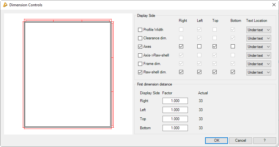 Defines the baseline distance of the first dimension chain to the facade element. In the input field for the relevant side specify the desired factor to change the distance. The default factor (1.0) causes the baseline distance of the first dimension chain to the facade element to be equal to the baseline distance of the dimension chains one to another.