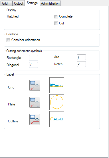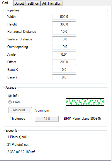 Shows how many complete and cut plates are needed for the selected outline. Furthermore, the area of the selected outline and the total area of all plates are shown.