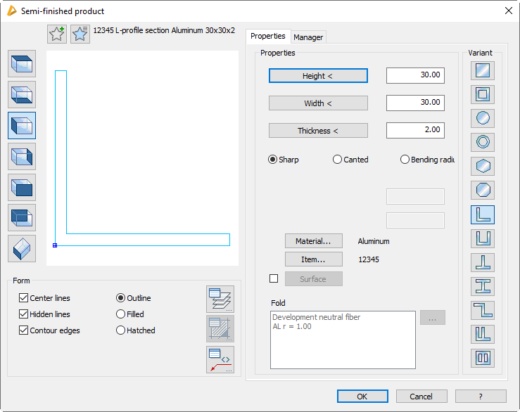 Creates a canted semi-finished product (folded sheet-metal part). With this option you can define a bending radius. This option is not available for all variants.