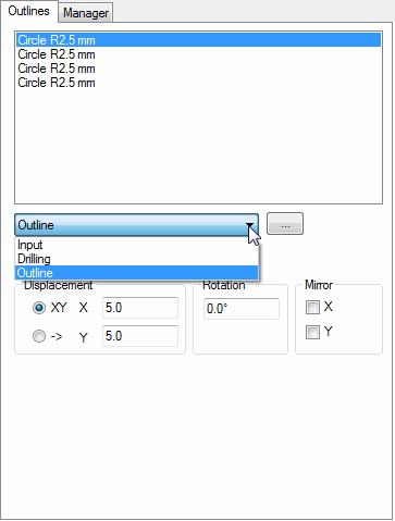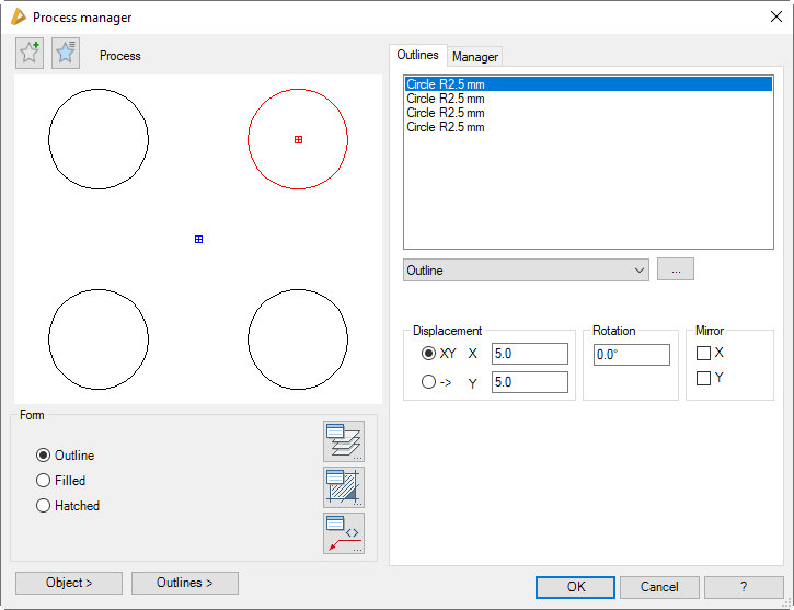 In the dialog box you will find on the left side the display section with the dynamic preview. On the right side you can see the operating section with the tabs Outlines and Manager.