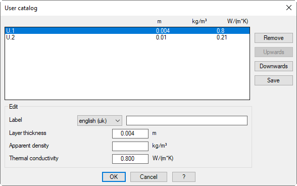Here you can change the building physics values of the selected material. You can adapt the label for various languages by selecting the desired language and writing the label into the input field. Furthermore, you can define the values for layer thickness, apparent density and thermal conductivity in the corresponding fields.