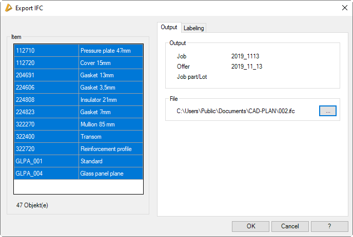 When you run the command, the Dialog box Projects is opened, where you can select a job or job part. When you close the dialog box with OK after selecting the job, you can make other changes in the following dialog box to be able to carry out the IFC export.