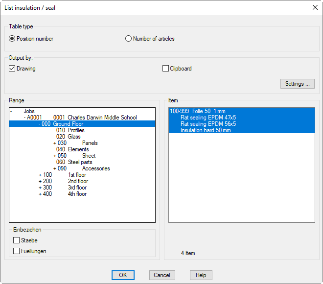 This command generates a parts list of the insulation and sealing materials. You can call the command directly from the context menu in the Project browser. This is done by right-clicking on the project branch that contains insulation, gaskets or seals.