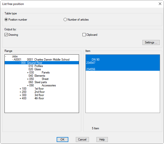 This command generates a parts list of the free positions (which have no reference to a drawing object). You can call the command directly from the context menu in the Project browser. This is done by right-clicking on the project branch that contains free positions.