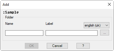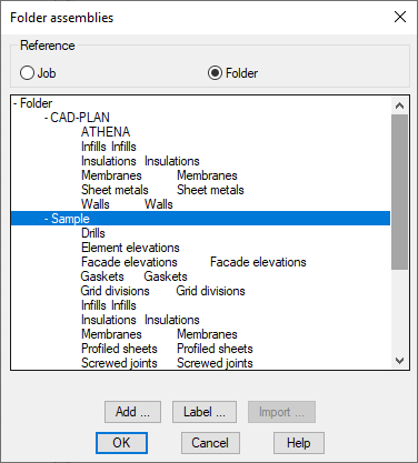 Complements the job part in the selected job structure or a subfolder in the selected folder structure. When the job option is activated, the Dialog box Add is opened, where you can specify the job data. You will find further information about jobs in Section Project Manager. When the profile system option is activated, the Dialog box Add folder is opened, where you can specify the manufacturer and system data.