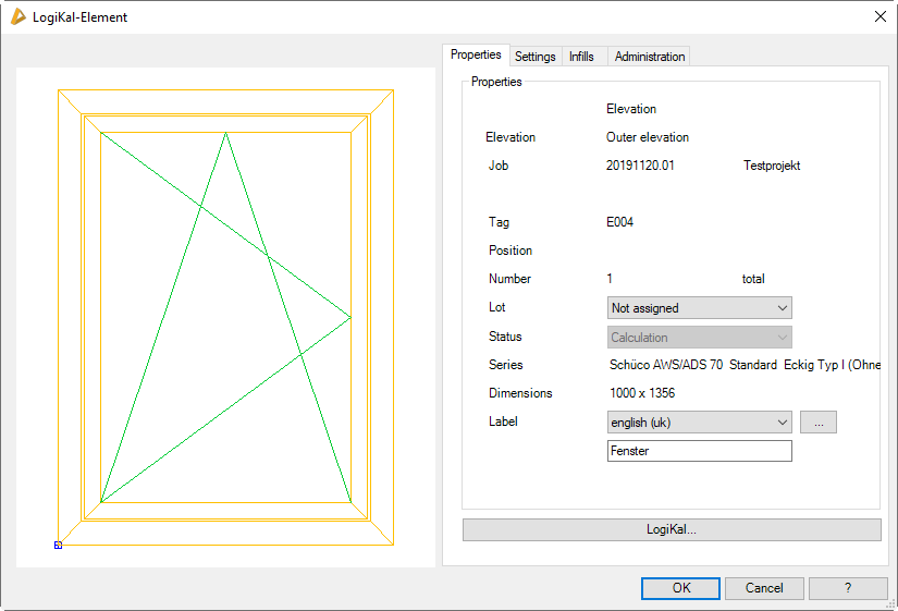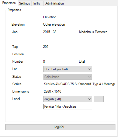 Here, the job and position properties of the LogiKal element are shown. Changes cannot be made here.