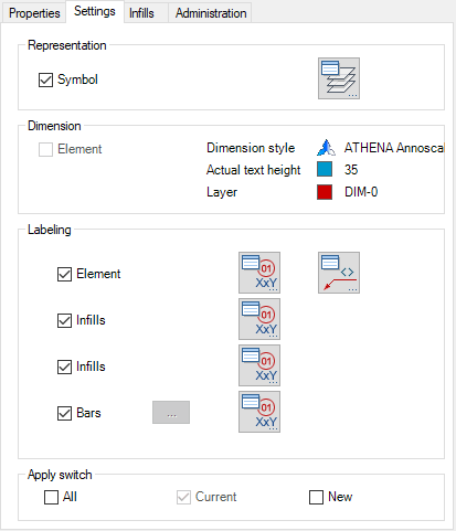 Controls whether the element is dimensioned. The drawing dimension settings are used for dimensioning. Dimension style, actual text height and dimension layer are displayed for information.