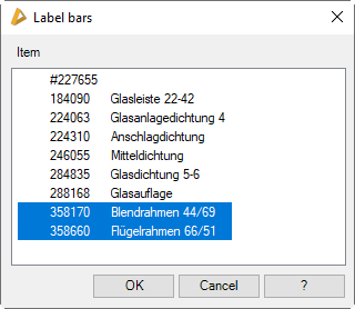 Shows a list of existing bars (item number and designation). Here, you select the bars which you want to label. A multiple selection with CTRL or SHIFT is possible.