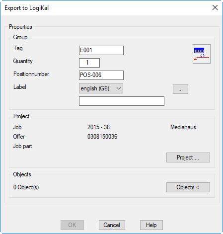 After calling the command the Dialog box Projects is displayed for the job assignment. Select here the LogiKal job and close the dialog box with OK. Then the Dialog box Export LogiKal is shown.