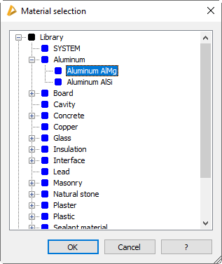 In this dialog box you can select a material to assign it to a part. The Dialog box Material selection is started when you click the button Material... in the dialog box for the relevant part.