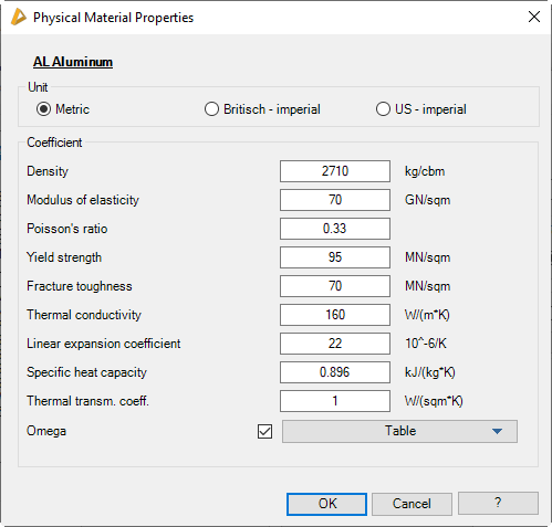Dialog box Physical Material Properties