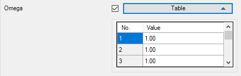 Opens up and closes the table of omega values. Click in a field of the table to activate it and to change the corresponding value.