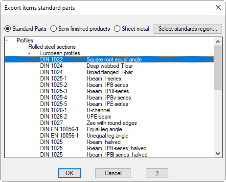 Shows the available standard parts in a tree structure. Here you can select the required standard with the mouse. Closed branches (standards groups) in the tree structure are identified with +. Open branches are identified with -.