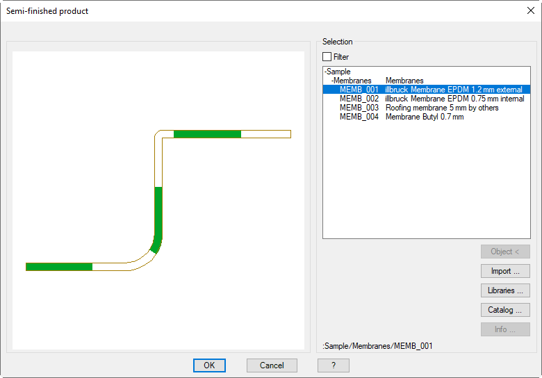 With semi-finished products, including Membrane, Insulation, etc., objects are masked out which cannot be used in the superordinate dialog box. Example: A membrane cannot be used in the Dialog box Insulation, so with an active filter no membranes are shown.