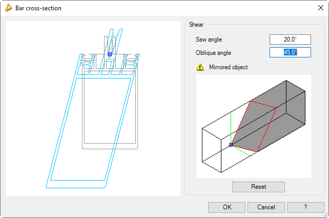 With this you can, for example, show the cross section of a transom which meets a mullion diagonally (miter cut) (e.g. to draw the outline of the double-miter cut on the mullion).