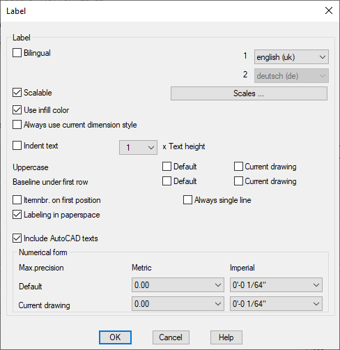 Activates the automatic scaling feature of the labels. The button Scales opens the Dialog box Label scales where you can assign scales to the labels from a list.