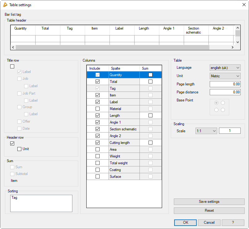 Defines settings for various output tables (e.g. parts lists such as bar lists, infill lists, etc.). Here, you can set the units and define which rows and columns are output.