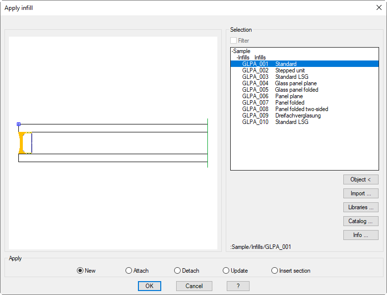 With this routine you can apply infills in the drawing. Infills are glasses or panels; they can consist of several layers and be applied two-dimensionally or three-dimensionally.